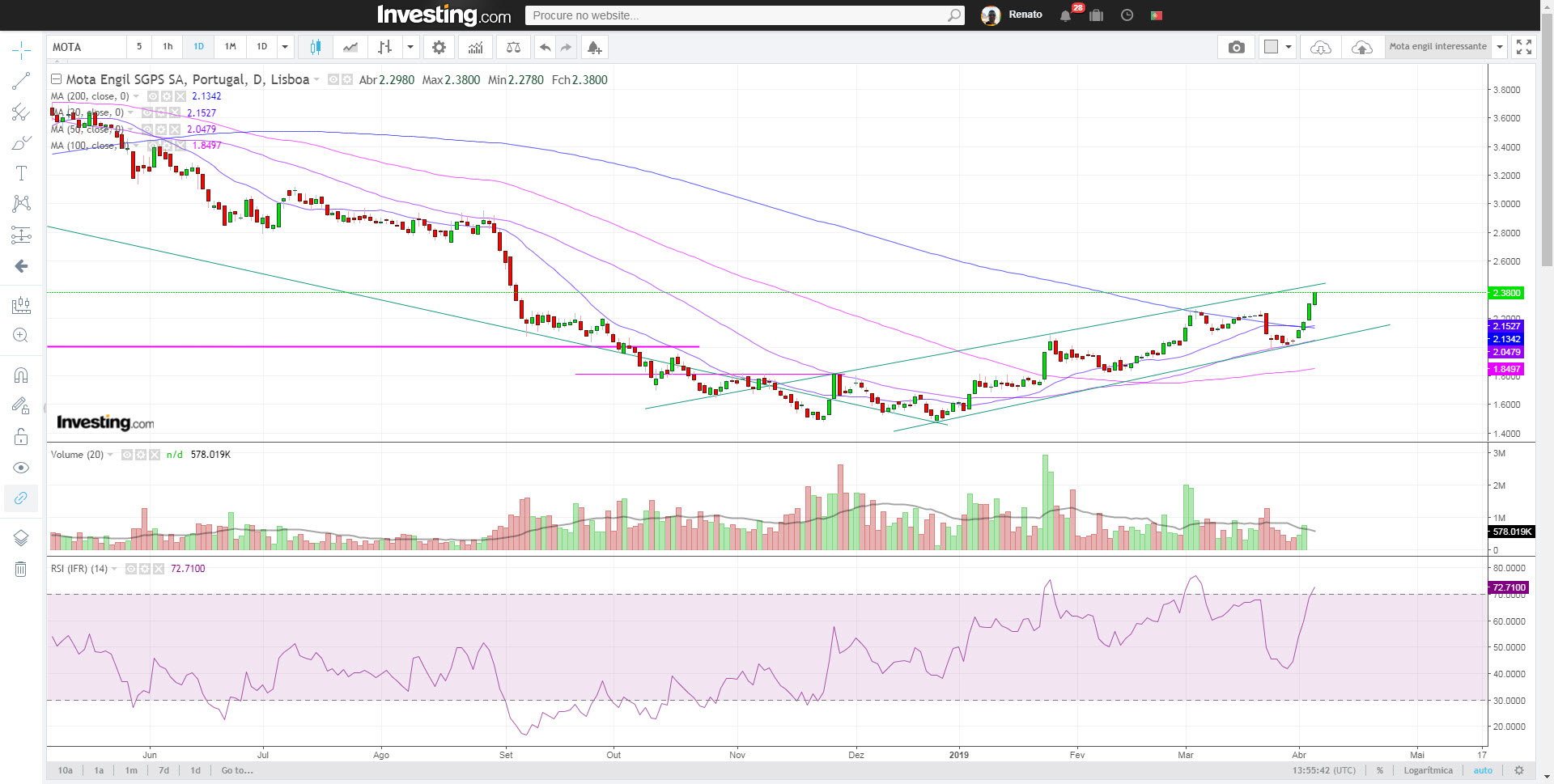 Surfei boa parte da onda do último bull da Mota, justificado ou não pelos fundamentais e resultados, depois deu-se um trambolhão enorme, agora nova fase ascendente, não quis desta vez crer que seria novamente bull da Mota, simplesmente pela proximidade temporal com o anterior referido, achando que o mais "normal" seria que fosse um falso breakout, mas esta luta com SMA200 está a ser dura e se a quebra pode visitar valores bem superiores. É vigiar com atenção aqui esta zona nos próximos tempos.