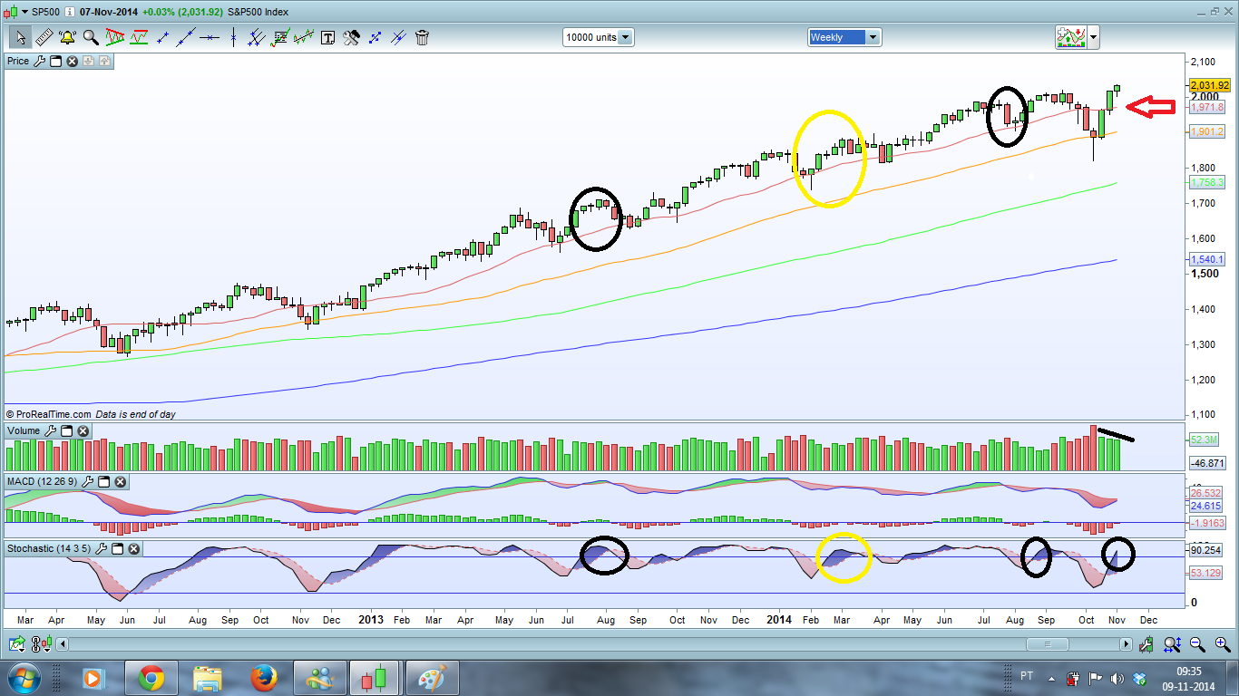 Em teoria costuma ser assim...mas nao estou muito para aí virado! No semanal, geralmente quando o estocastico está com a configuraçao que está actualmente, geralmente alivia um pouco e quando o preço se afasta da MM20...depois vai lá dar um beijinho, por isso é bem provavel que o SP possa ir lá dar um beijinho nos 1970...da mesma forma elegante que se comportou nas ultimas 3 semanas!