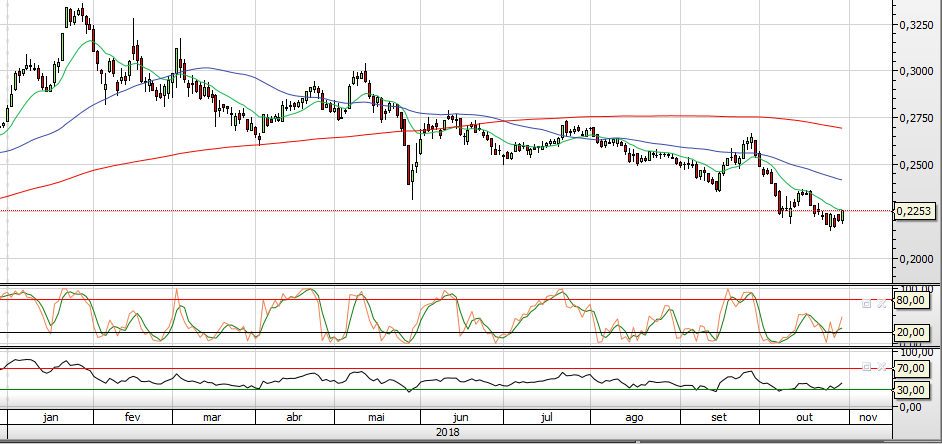Os vendedores andam em fortes vendas há 5 dias entre 0.2220 e 0.2237.