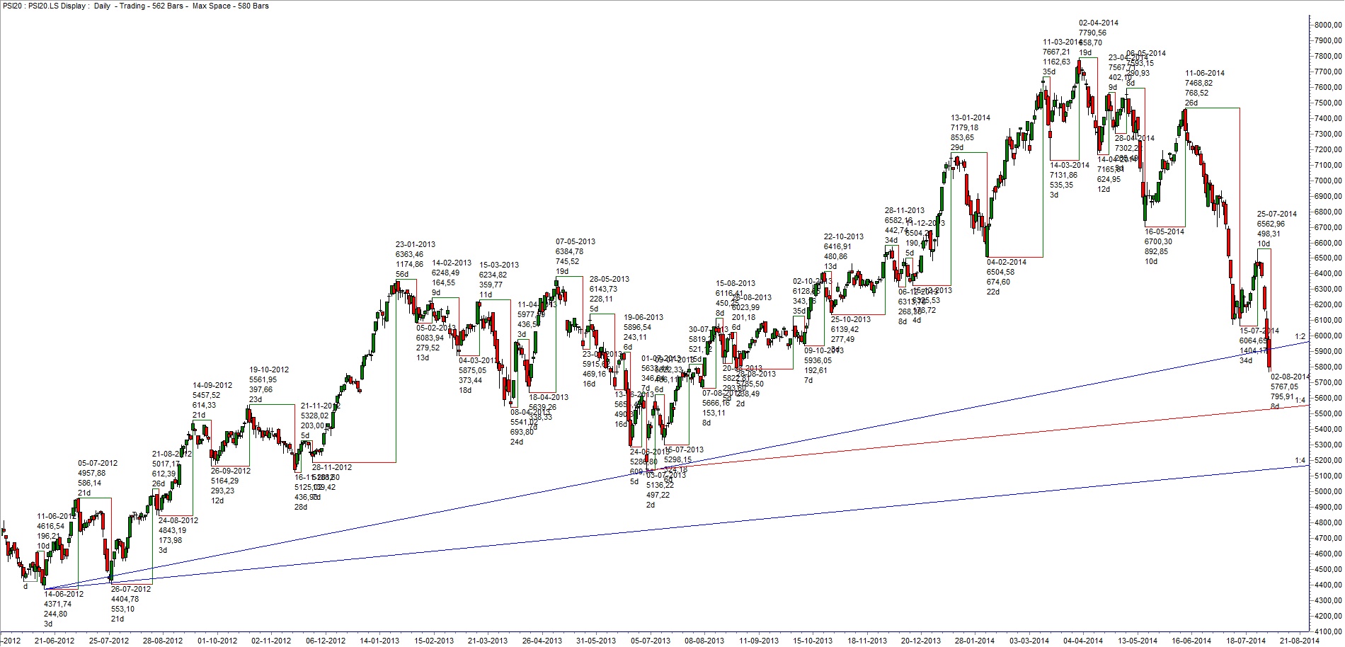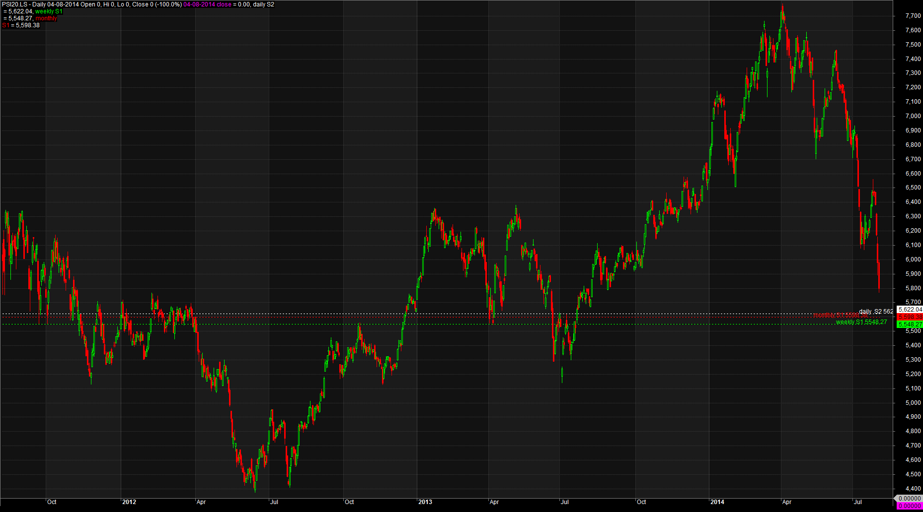 Certamente essa semana, se não já amanhã, vamos tocar e talvez romper o suporte de 5700. São demasiadas notícias que não favorecem: Ukrania, Israel, Argentina e principalmente o BES. No caso do BES, o governo e o BdP conseguiram essa semana acabar com a pouca credibilidade que ainda existia. Demasiadas declarações que, por fim verificamos, serviram apenas ajudar alguns (os mesmos) a "pularem fora" antes do Tsunami!