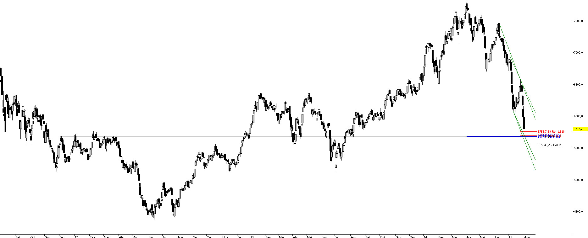 Apenas analisando preço e tempo, no timeframe diário, e nada mais, apresento uma zona a vigiar entre os 5756,7 e 5548,27.