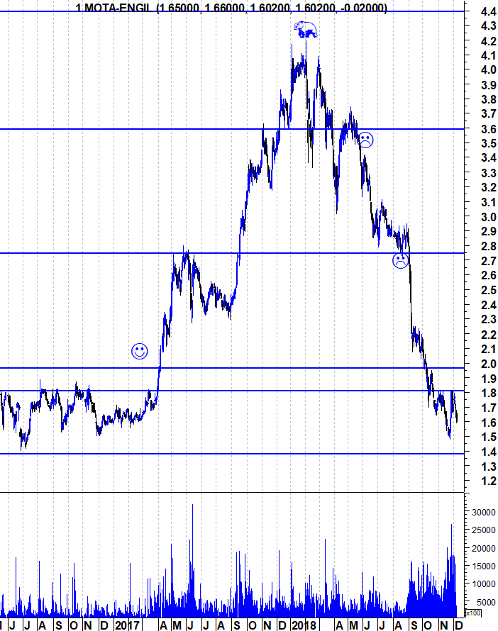 Depois de 2 dias de ressalto violentíssimo, a Mota regressou às quedas. O condão daquele ressalto é que veio reforçar a zona dos 1,81 como ponto de referência para a Mota. A acção continua no seu "Bear Market" e, para quem quer entrar no papel, deve esperar a quebra de uma resistência que indicie que algo mudou. Neste caso, a quebra da resistência dos 1,81 euros seria um forte sinal de força. enquanto isso n~ºao acontecer, todas as subidas são apenas meros ressaltos antes do regresso às quedas.