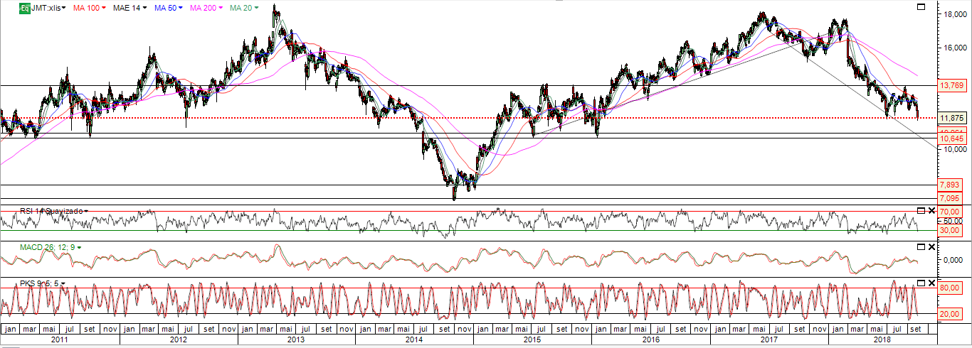 A JMT esta a fazer um recuo técnico perfeito até a EMA 14 nos 11.56 onde já fez hoje máximos e onde fica a resistência dos últimos 12 dias de negociação .