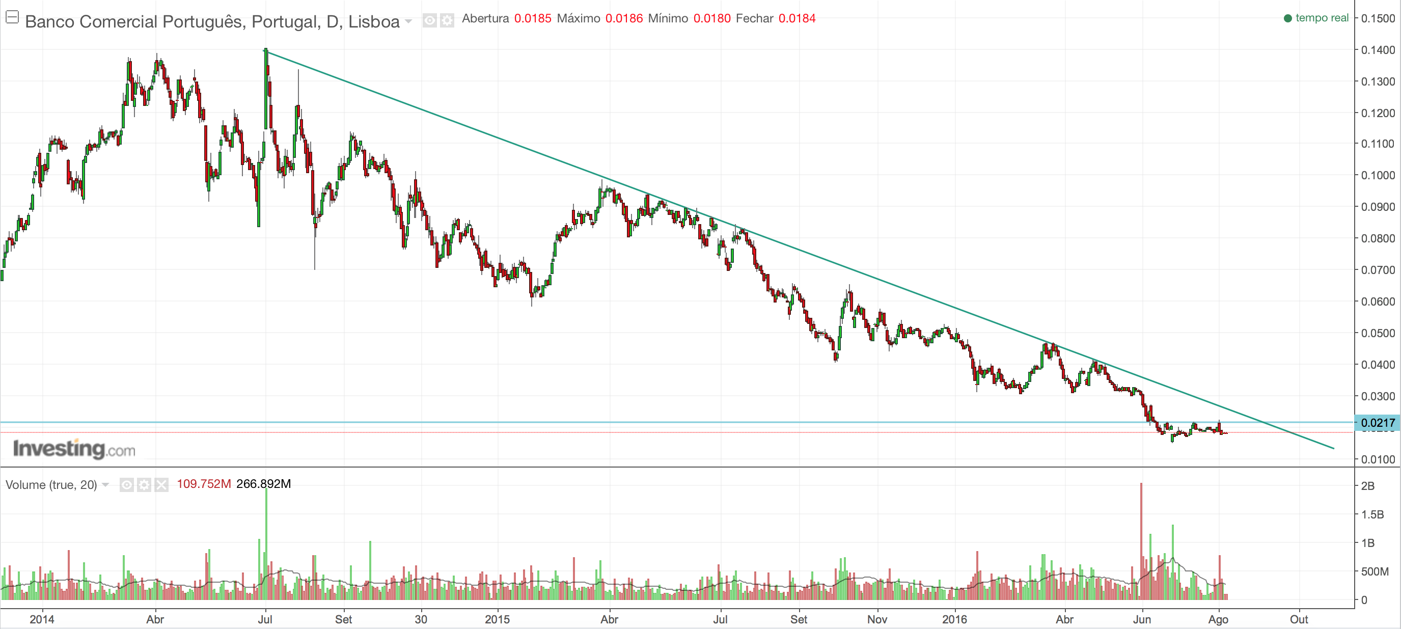 No dia 27/07/2016, o mínimo do BCP foi 0,0182 euro, em 02/08/2016, foi 0,0181 euro, e hoje, 0,0180 euro. A diferença de cotação é muito pequena, mas é muito significativa!