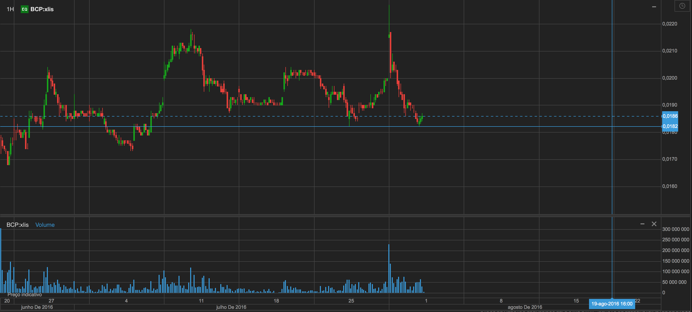 Suporte no mesmo valor de 27jul aos 0,0182€, mas nada de sinais de recuperação.