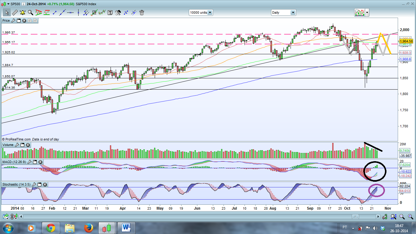 a cinzento um possível IHS e por isso posso esperar um pequeno retrace para fazer o segundo ombro e faz 1928-1986 ou entao (esta porra é que é a variavel da equação)...a amarelo o gajo vai logo aos 1986...eu penso que as MM vao fazer baixar o preço, volume descendente e estocastico a começar a ficar overbought!