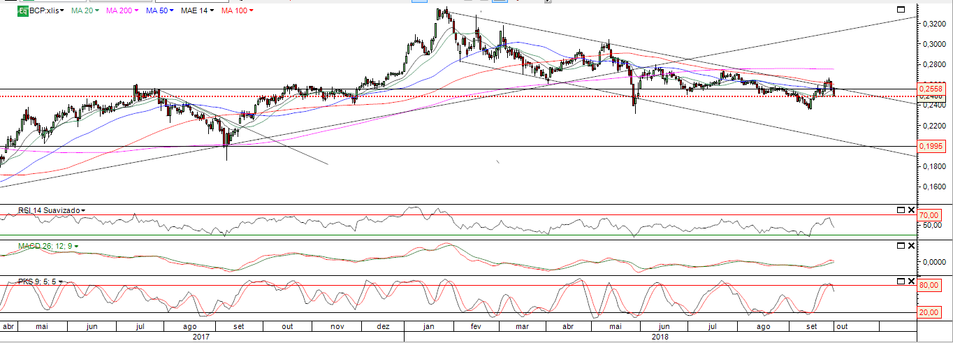 BCP após a recuperação desde os 0.2350 , tem os indicadores técnicos STK e RSI ainda elevados , pelo que em termos técnicos ainda tem muita margem para quedas para valores inferiores.