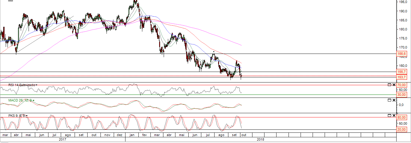 Indicadores técnicos STK e RSI , ainda longe de mínimos de sobrevenda e com espaço para cair .