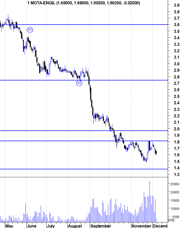 Depois de 2 dias de ressalto violentíssimo, a Mota regressou às quedas. O condão daquele ressalto é que veio reforçar a zona dos 1,81 como ponto de referência para a Mota. A acção continua no seu "Bear Market" e, para quem quer entrar no papel, deve esperar a quebra de uma resistência que indicie que algo mudou. Neste caso, a quebra da resistência dos 1,81 euros seria um forte sinal de força. enquanto isso n~ºao acontecer, todas as subidas são apenas meros ressaltos antes do regresso às quedas.