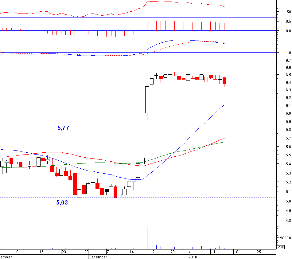 É interessante notar que o Chaikin Money Flow caiu fortemente - esta queda do CMF no dia de hoje deve-se ao facto de o período utilizado para calcular este indicador ser de 21 dias, pelo que hoje deixou de ser considerada a sessão de 18 de Dezembro. Ou seja, neste momento é possível ver que já não está a haver qualquer acumulação.