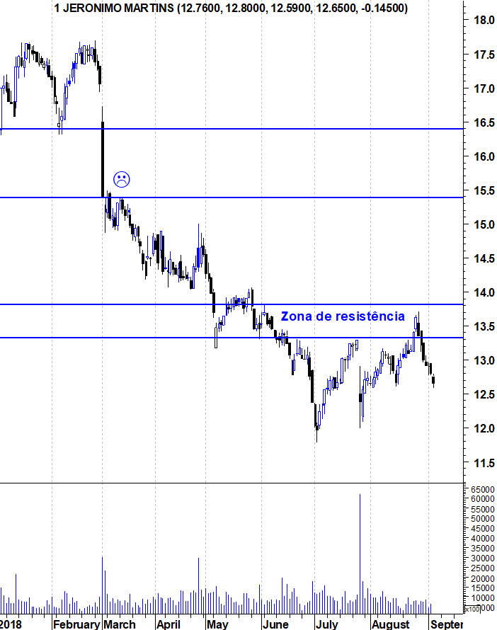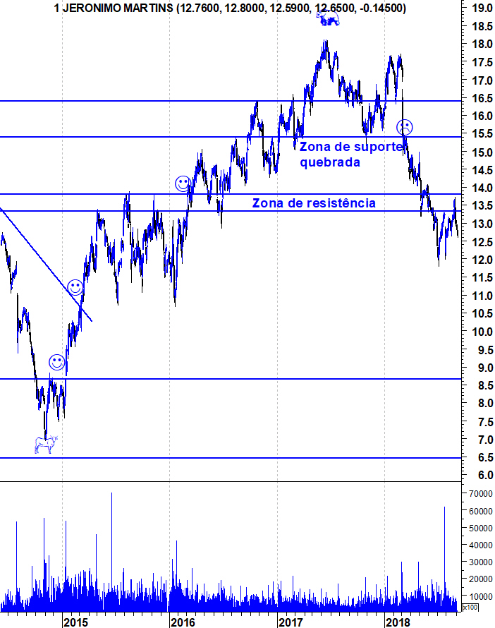 À medida que o "Bear Market" na JM vai continuando, vai sendo possível definir resistências relevantes que limitam os ressaltos e que, caso sejam quebrados, podem indiciar a inversão da tendência descendente. Neste caso, a zona de resistência relevante situa-se entre os 13,3 e os 13,9 euros. Enquanto a JM não conseguir quebrar essa resistência, continuo com o mesmo cepticismo que mostrei desde que em Março deste ano, a JM quebrou o suporte que considerei decisivo.