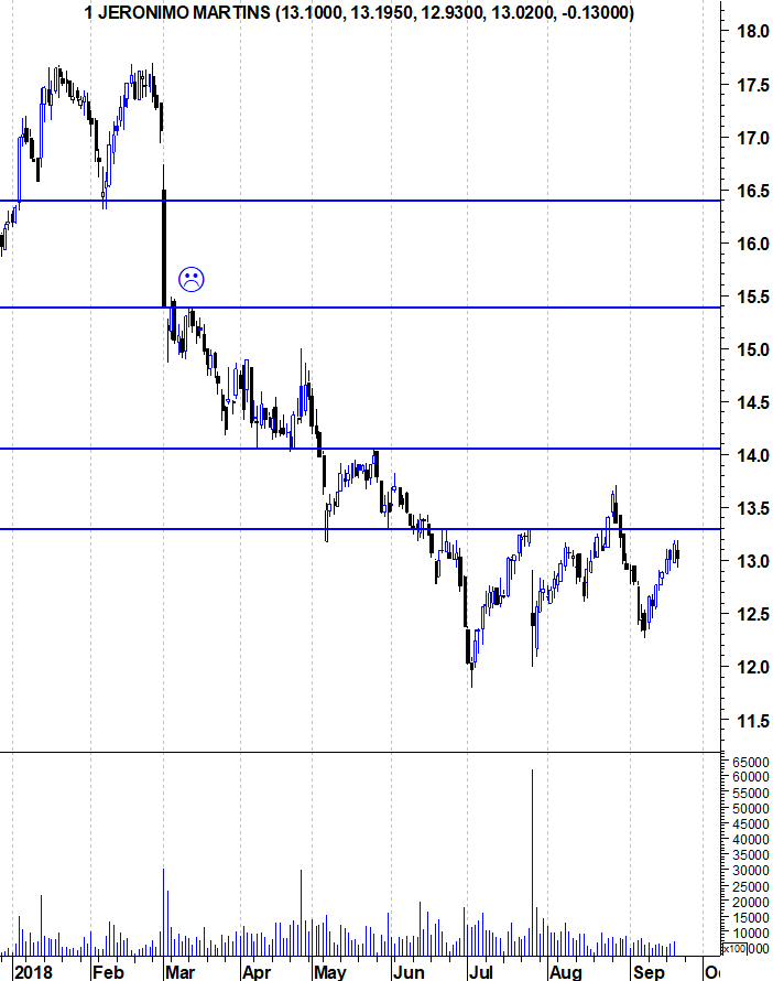 Vamos lá então reformular isto. 13,3 é a primeira resistência da JM, É verdade que, recentemente, já teve dois fechos acima desse valor, mas foi esporádico e sem consistência. Essa é a primeira batalha a ter que ser vencida pelos touros. Mas a resistência verdadeiramente importante é a dos 14,10 euros.