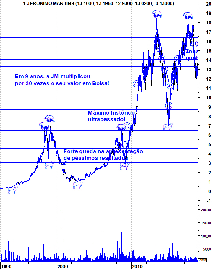 Ulisses Pereira Escreveu:À medida que o "Bear Market" na JM vai continuando, vai sendo possível definir resistências relevantes que limitam os ressaltos e que, caso sejam quebrados, podem indiciar a inversão da tendência descendente. Neste caso, a zona de resistência relevante situa-se entre os 13,3 e os 13,9 euros. Enquanto a JM não conseguir quebrar essa resistência, continuo com o mesmo cepticismo que mostrei desde que em Março deste ano, a JM quebrou o suporte que considerei decisivo.