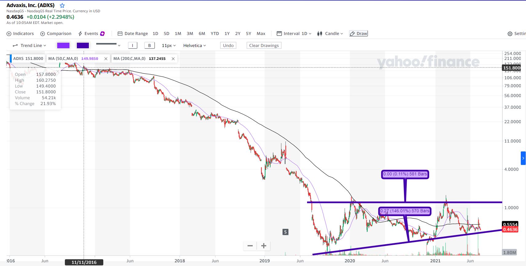 zulu404 Escreveu:Boa tarde. Alguém que possa ajudar com a Advaxis INc (ADXS). A semana passada deu um pulo aos 0,70 e ontem voltou a ir aos 0,44. Têm algumas coisas em aprovação e fala-se duma aquisição. Se alguém acompanhar a empresa e poder dar uma ajuda até na leitura do gráfico agradeço desde já. Obrigado e bons negócios a todos.