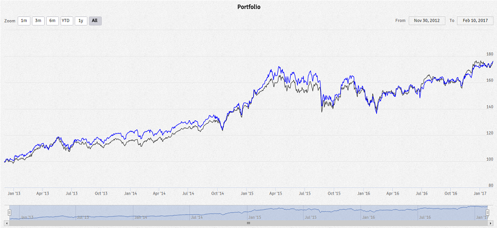 Em baixo a comparação. MFS Global Equity a azul e o Pictet-Quality Global Equities R a cinza. O MFS tem um pouco mais de volatlidade mas nada de especial. Testei desde 2012-11-30, data do começo do Pictet!
