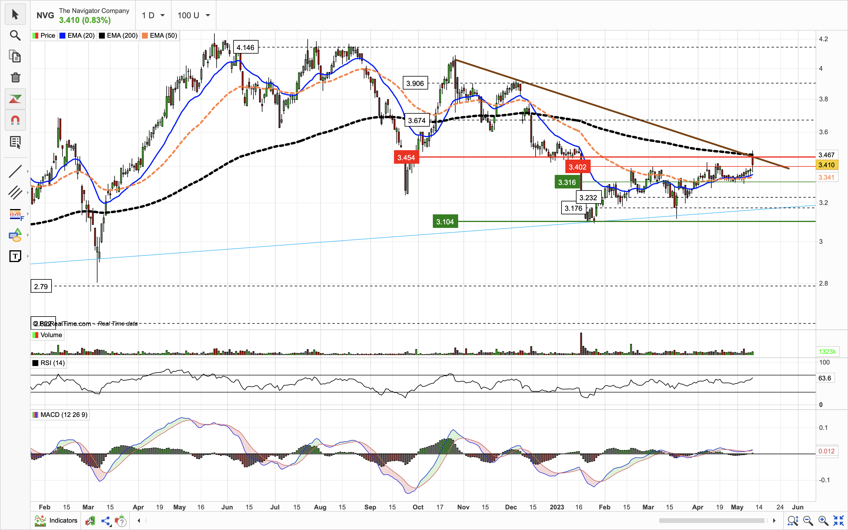 Em termos fundamentais, a NVG foi muito penalizada pela fortissima queda da pasta - nos ultimos 6 meses caiu cerca de 30%. Agora está sobre um suporte. A NVG seguiu esta queda, mas nos ultimos meses tem conseguido aguentar-se e divergir um pouco. Os resultados de 1º trimestre foram bons, apesar deste contexto adverso. Se a pasta reagir neste suporte, a cotação poderá subir fortemente, porque entretanto a NVG mostrou força e adquiriu nova empresa, diversificou, etc.