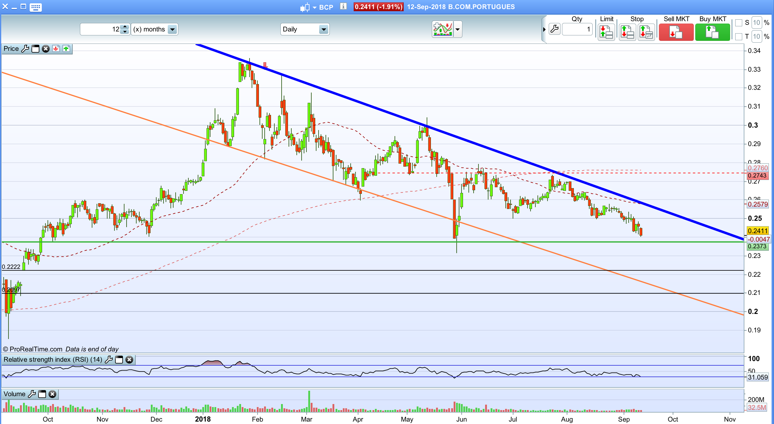 Em termos fundamentais nada explica esta longa queda, em termos de AT, para mim encontra-se num ponto já em bear market desde os 0,26, para mim, por isso as vendi aos 0,265, porque após resultados costuma caír mas nunca pensei que a queda fosse assim tão longa.
