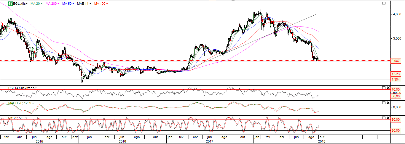 Quanto ao gráfico da Mota Engil, consolida há algumas sessões com RSI ascendente, sendo que o preço está na zona do máximo de 2016.
