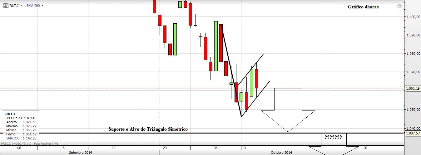Parece que agora está tudo muito crente numa subida iminente, já ali ao virar da próxima esquina (vela)... Olhando para o Russell foi-me mais fácil aproveitar a queda do S&P500 porque este Índice permitiu uma mais clara análise do caminho e como gosto muito de Triângulos Simétricos ainda mais confiante fiquei. É por isso que continuo a olhar para ele com atenção, pode ser que sinalize o fim desta correção, já que ele também foi o primeiro a quebrar a M200, aquela que apenas ontem e com grande estrondo o S&P500 conseguiu quebrar. Posto isto e olhando para o Russell o que é que eu vejo? Uma Bear Flag a formar-se no diário e outra já bem visível no gráfico de 4 horas.