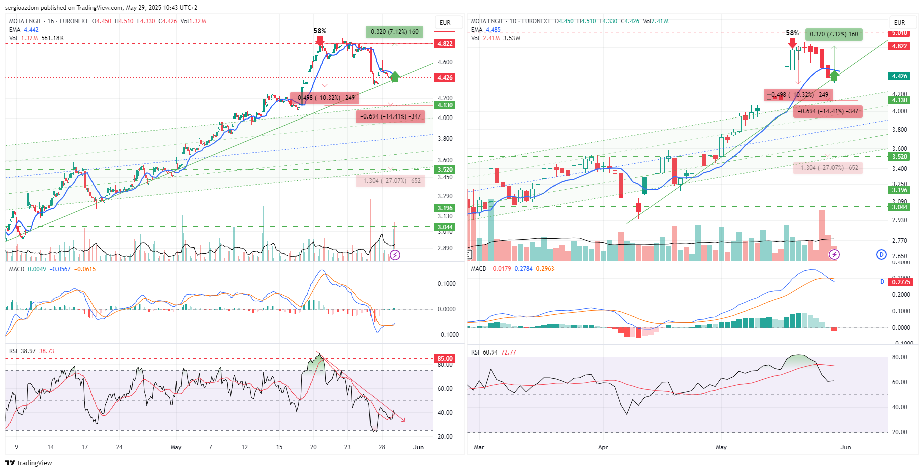 no diário (grafico da direita), dá ideia que a queda pode ser entre os 15% (4,13€ - limite superior do canal rompido há 2 semanas) e 28% (3,52€ limite inferior do mesmo canal). vamos vendo..