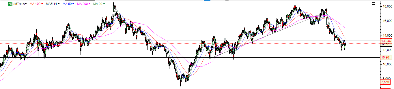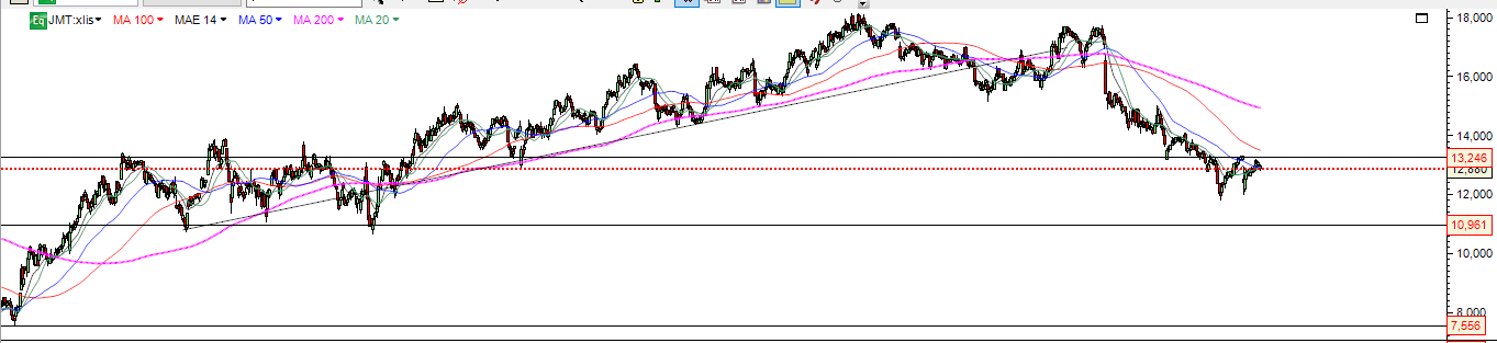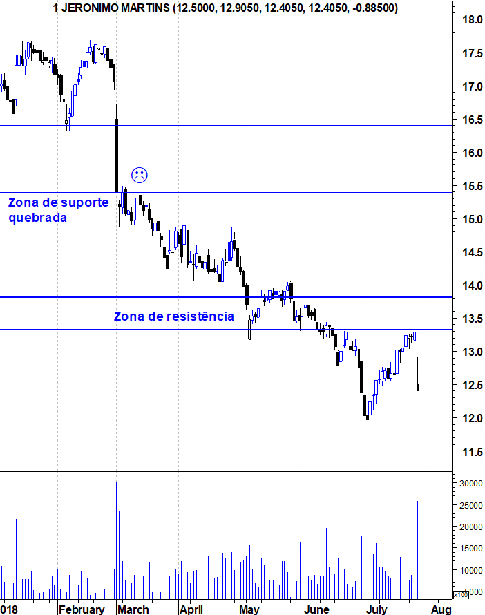 Quanto à análise técnica da acção nada de novo. A JM continua na sua tendência descendente identificada em Março, na altura da quebra do suporte nos 15,4 e agora, depois de um ressalto até uma resistência, bateu lá de cabeça e retomou a sua tendência.