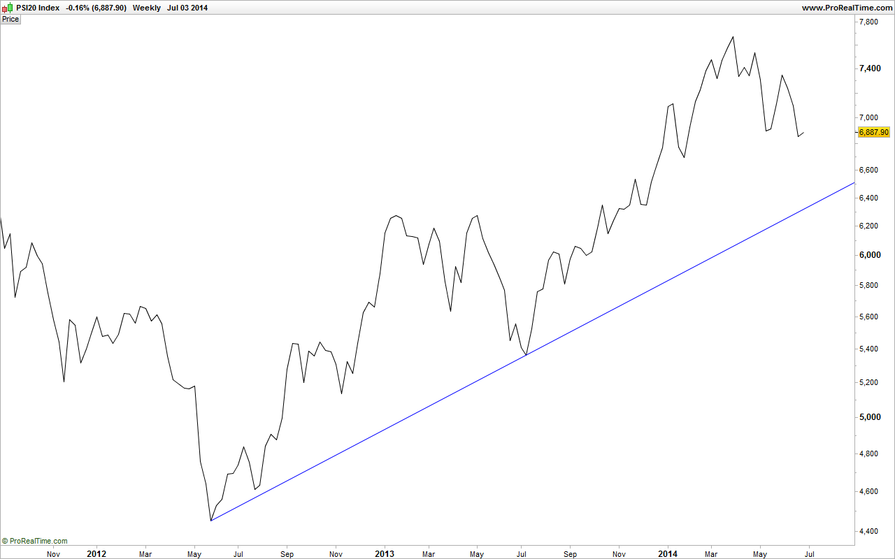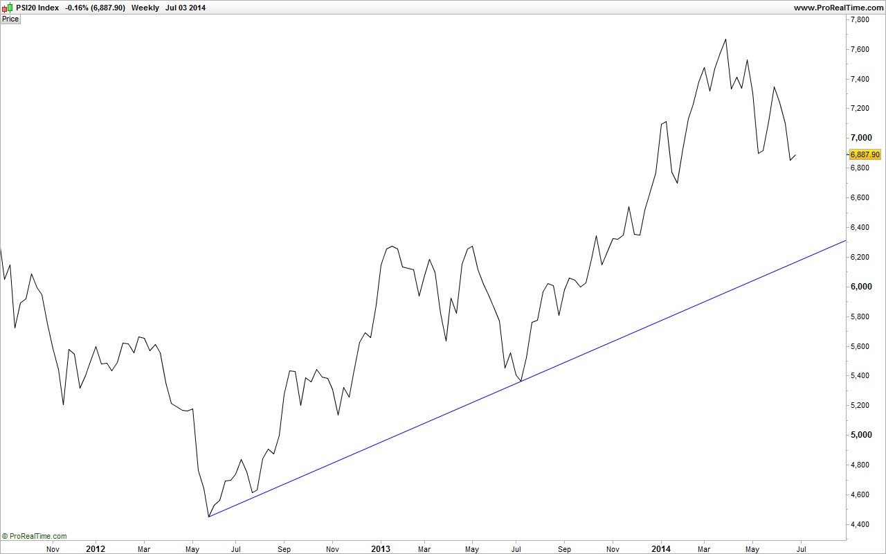 O PSI20 esta semana não teve mínimos inferiores aos de 16 de Maio, o que foi muito importante para a continuidade deste bull-market. Tal como há um ano atrás, o "irrevogável do Paulo Portas" fez crer que o suporte 5700-5550 teria sido quebrado de vez, na minha perspectiva e tendo entrado longo recentemente em algumas acções do PSI20, acho que o suporte à volta dos 7150 pontos poderá não virar resistência e poderemos aguardar mais uns 9-10 meses de subidas no PSI20. Nos últimos 2 anos, os arranques para as subidas verificaram-se em Julho, após o mal-amado 2º trimestre, e corresponderam a valorizações de cerca de 45% no índice. E julgo que, após estas indefinições na banca portuguesa ficarem concluídas, as subidas serão ainda maiores diariamente, devido ao peso que o BCP e o BES têm no índice. E mais, temos acções com bastante peso no índice, como a Galp e a EDP (representam juntas cerca de 1/3 do PSI20!!!), com tendência claramente bull. Deixo os gráficos, onde se pode visualizar a possível formação de um duplo-fundo, com projecção nos 8300 pontos.