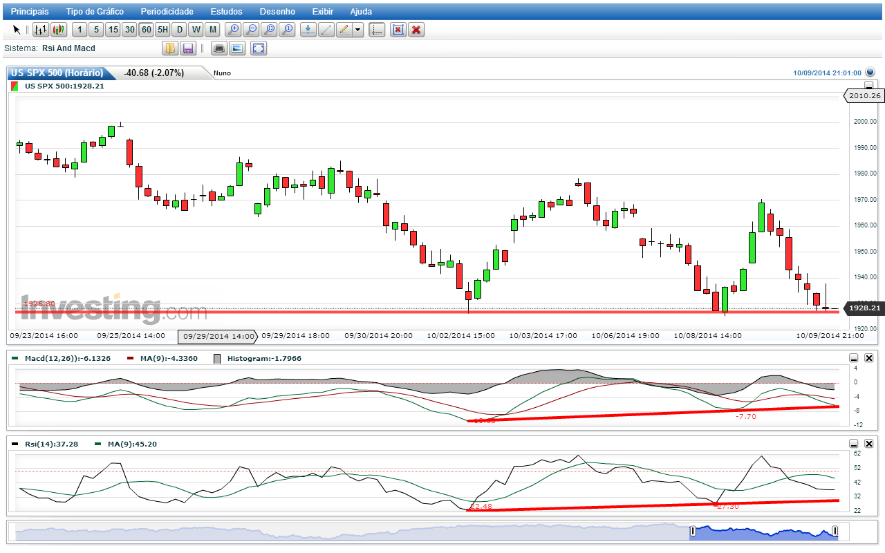No gráfico de 1h do S&P500 já se vê um a divergência positiva. Será que vai ao suporte de 1905, ou sobe antes. Qual a vossa opinião?