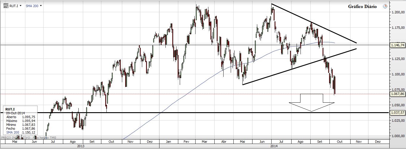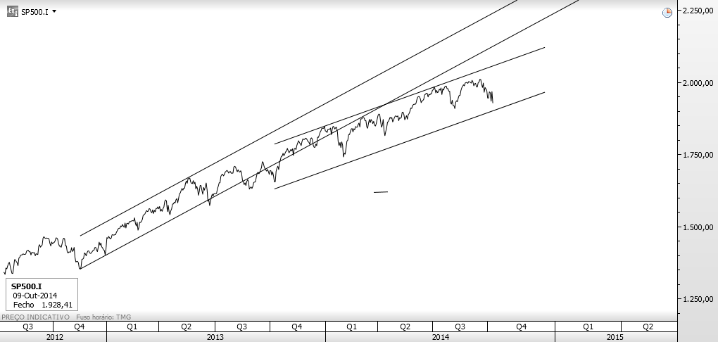 Estive a olhar para os gráficos e acho que o Preço vai parar de cair nos 1886 mais ponto menos ponto. Porquê? Primeiro porque olhando para o Russell parece existir ali uma zona que pode aparar a queda e que é o alvo do triângulo simétrico e também uma zona de resistência/suporte. Naquele local julgo ser muito provável uma reacção em alta. Percentualmente falando está a uma distância mais ou menos idêntica à dos 188ss do S&P500. Depois no Semanal essa é a zona onde está a M50, das últimas duas vezes que o Preço lá foi não esteve muitos tempo por baixo dela, reagindo depois em alta. Curiosamente se o Preço ficasse por ali dava um bonito canal ascendente (escala logarítmica!)...