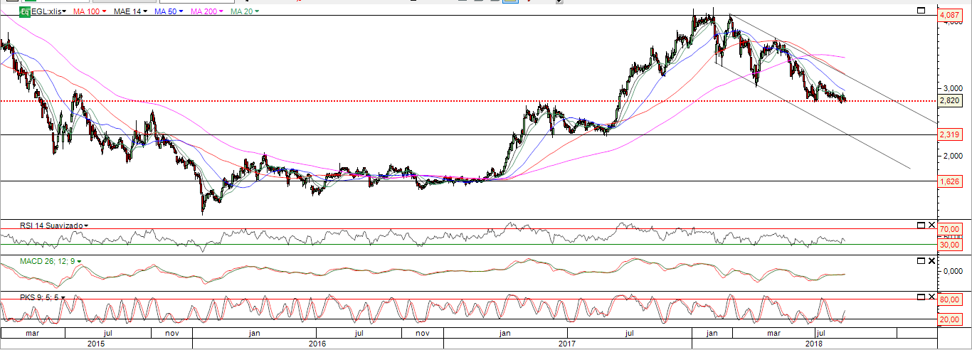 Tenta aqui aguentar o ténue suporte de 2.80 , com fracos fundamentais operacionais desde há 3 anos , o mais provável é continuar a corrigir , tendo um suporte intermedio nos 2.30 euros .