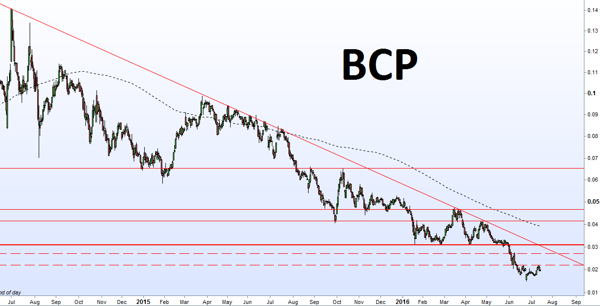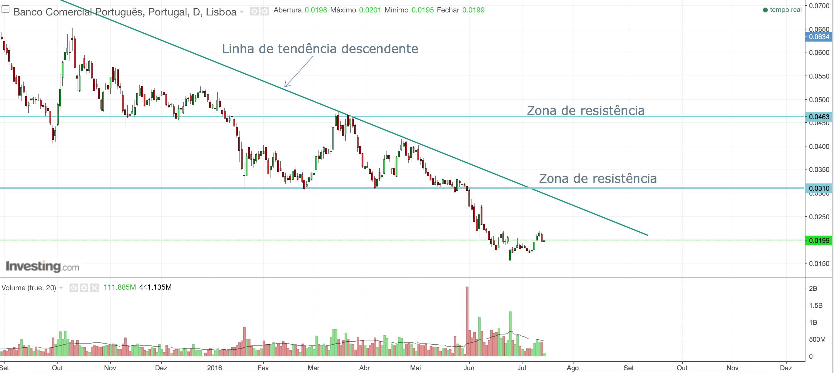 Analisando o gráfico mais detalhadamente, identificam-se duas zonas de resistência: a primeira aos 0,0310€ e a segunda aos 0,0463€, aproximadamente, conforme descrição no gráfico abaixo. Um primeiro sinal de força seria a quebra em alta da linha de tendência descendente, que vigora já desde Julho de 2014. Sinal ainda mais forte é a quebra da resistência aos 0,0310€. Esta resistência é muito importante, pois aí o Bear Market do BCP poderá ter terminado. Caso quebre a resistência dos 0,0463€, considerarei que o BCP estará em Bull Market.