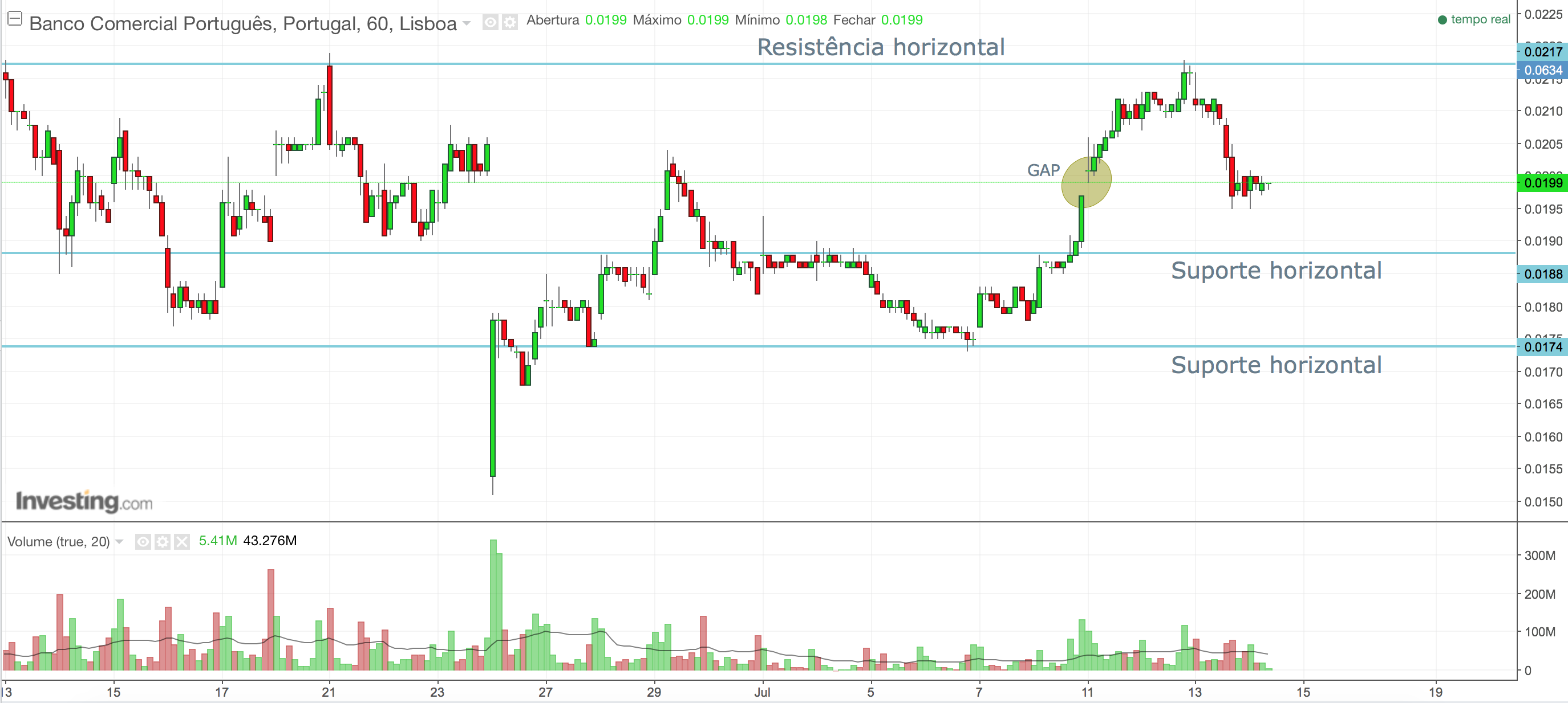 No entanto, voltando à realidade e olhando para o gráfico horário seguinte, ontem a acção veio fechar um GAP existente entre o fecho do dia 10 e a abertura do dia 11 de Julho (duas velas consecutivas que não se tocam) e neste momento estamos numa zona de incerteza. Poderá ter vindo apenas fechar o GAP e as subidas continuam, mas caso continue a descer existem dois suportes não muito fortes aos 0,0188 e 0,0174€. Caso quebre em alta os 0,0217€ seria muito bom sinal para os compradores e a acção aí penso que estaria encaminhada para os 0,0310€. Para quem quer entrar no título, eu aguardaria por uma quebra em alta destes 0,0217€, embora ainda com risco.