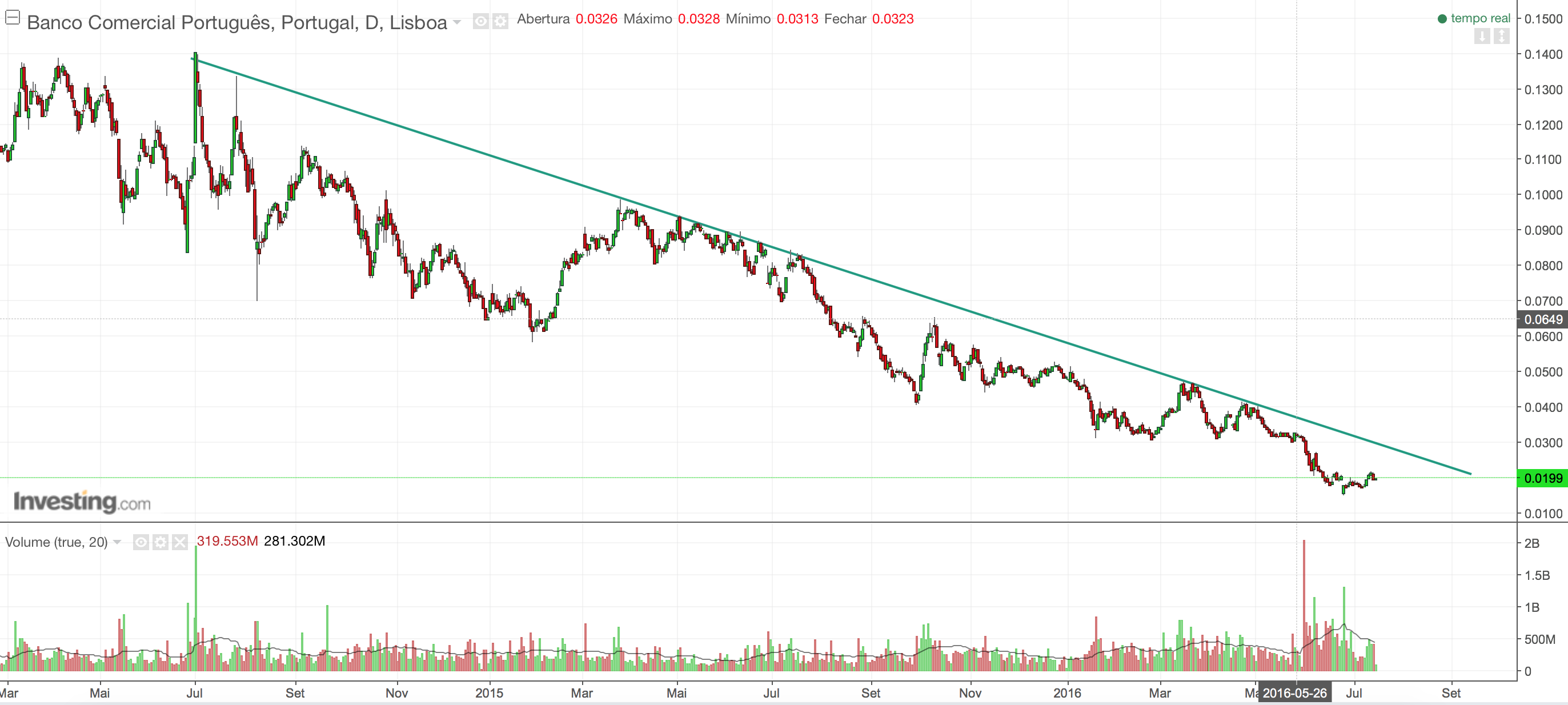Calculando o declive da recta descendente que vem desde Julho 2014, consegue-se perceber que a cotação vai tocar no zero entre o dia 20 e 30 de Janeiro 2017 aproximadamente. Pergunto por isso (segundo a análise técnica) o que isso quer dizer: das duas uma, ou a o banco vai falir nessa data e a acção fica suspensa pela CMVM ou então é certo que a acção vai inverter a tendência antes dessa data?