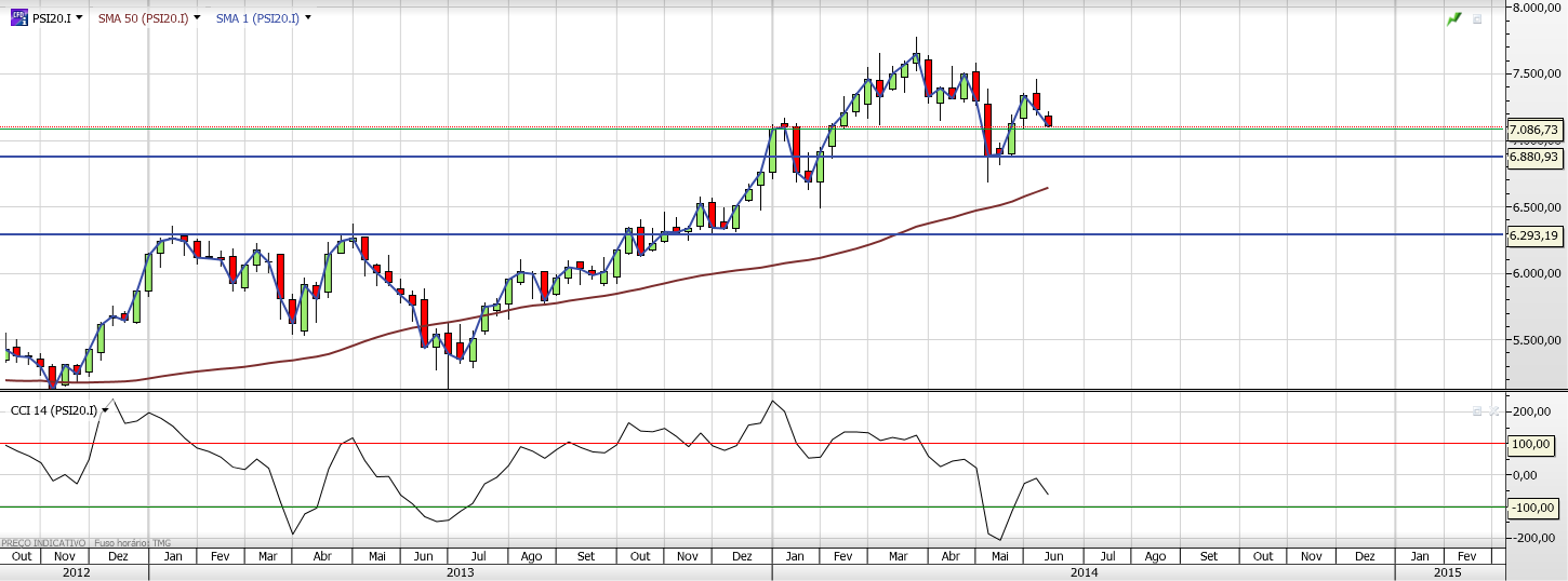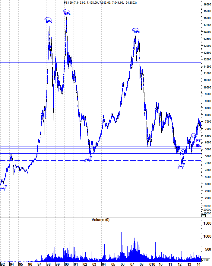 Cenário B - pessimista para o curto-médio prazo: LTA que vem desde inicio de Agosto de 2013 quebrada em baixo; sell-off generalizado até à fronteira Bull-Bear, entre os 6300-6400, com pequenas reacções em alta ao passar por cada nível de suporte. A favor deste cenário: situação de muita instabilidade e incerteza na banca; AC do BCP ainda por anunciar oficialmente; várias cotadas ainda em Bear (JMT e PT) e outra zonas de inversão de tendência (Sonae, Altri, Zon, banca...).