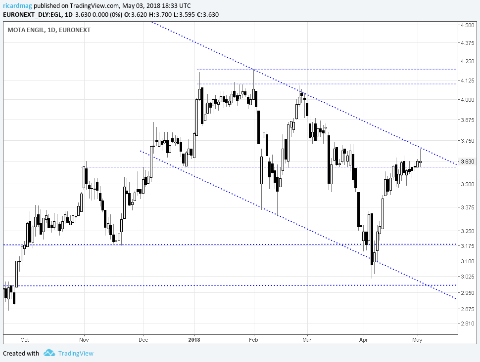 Diria que a zona dos 3.70-3.75 EUR são a resistência, há muitos candles no passado nesta zona (há uma lateralização em Dez/2017 e Março/2018, segundo o gráfico diário).