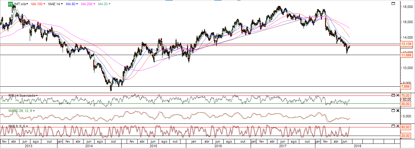 Somente uma pequena recuperação devido á rapidez da queda e indicadores sobrevendidos e uma pequena recuperação até á MM50 e mantendo-se no range de preços do intervalo em que andou muitos meses em 2015