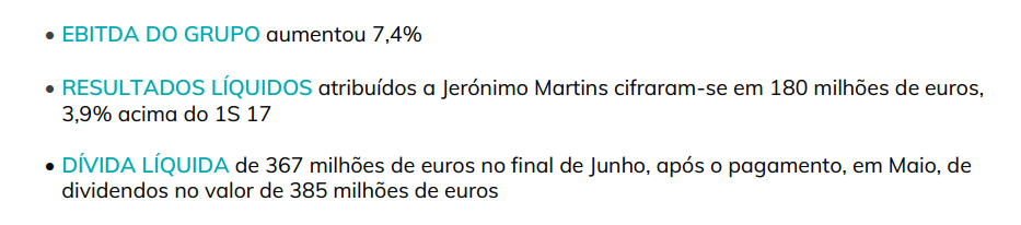 A Jerónimo Martins obteve 180 milhões de euros de lucro no primeiro semestre, uma subida de 3,9% face a igual período no ano passado, informou esta quarta-feira a empresa. Os analistas esperavam aumento de 5% nos lucros para 182 milhões."
