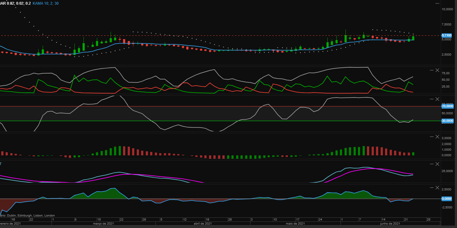 Penso em sair na abertura, se perder a força e não ultrapassar os 5$. Mas se voltar aos 4$, reforço uma tranche.