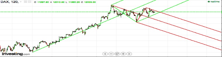 de facto é uma sorte termos o Alquimista e tb o Tim Morge para nos ensinarem a teoria, dps saber aplicar os conhecimentos na prática (e no momento certo) já é outro malabarismo... e, nesse sentido, e tb na sequência da conversa que referes (e para que os erros me fiquem gravados na memória), anexo o gráfico horário do DAX que negociei entre 5ªf e hoje, de forma contra-exemplar - neste caso uma entrada longa na 5ªf +- nos 11980 e outra curta hj a 2/3 do caminho para cima, ambas com algo em vista, mas feitas de forma muito precipitada. o que tinha em vista com o longo já tinha explicado anteriormente, e essa ideia acabou por verificar-se de certa forma: o índice fez novo máximo relativo, e, no meu entender, o preço demonstrou alguma força, ainda não suficiente, no entanto, para fazer novo máximo absoluto.