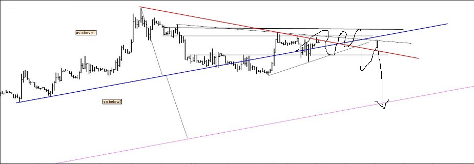Oportunidade especulativa em ebulição: se o preço decidir não respeitar a linha azul, realizar-e-á um short com stoploss acima do pivot relevante e target (para já) na minha inferior (as above, so below).