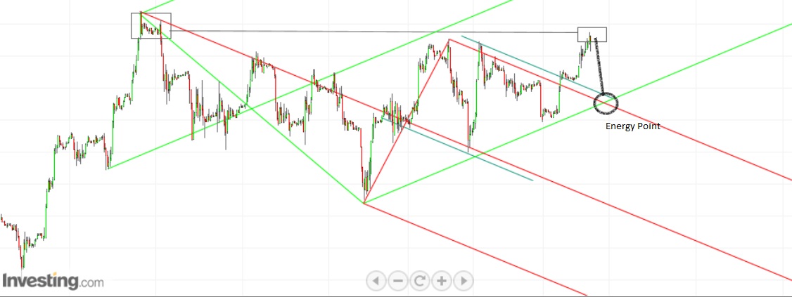 quanto ao curto, a minha ideia era um reteste à linha superior da fork vermelha, nomeadamente na intersecção com a fork verde - o Tim Morge refere a frequência dos retestes às linhas das forks após estas terem sido quebradas, antecipando o disparo final - e na sequencia disso mesmo, a minha questão é esta: faria sentido o preço ir testar a UML da fork vermelha dps de ter disparado (fazendo por ex. o movimento que tracei até ao "Energy Point"), ou esse reteste já tinha sido feito durante o slide na linha azul antes de ter ido para cima (nesta escala é dificil de ver, mas o preço andou a saltitar na sliding parallel antes de ter disparado, e daí a minha dúvida - poder-se-á considerar esse caminho saltitante o próprio reteste?).