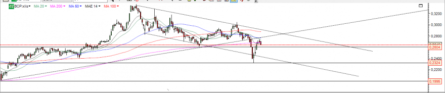 Mantem se abaixo do suporte dos 0.26 e em breve poderá testar a zona de suporte dos 0.23