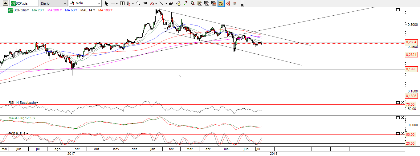 O BCP está numa situação difícil de contexto, pois a meu ver, a banca europeia em geral está em bear market, o que tem sempre o seu efeito nefasto no BCP. No entanto, o BCP, a meu ver, continua tecnicamente em bull market, estando já em correcção há algum tempo, mas que pode até ser saudável, pois não me parece que tenha sido suficiente pra já para inverter a tendência. Veremos o que acontece daqui para a frente e após resultados.