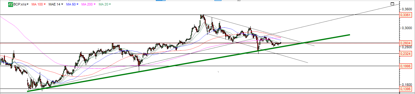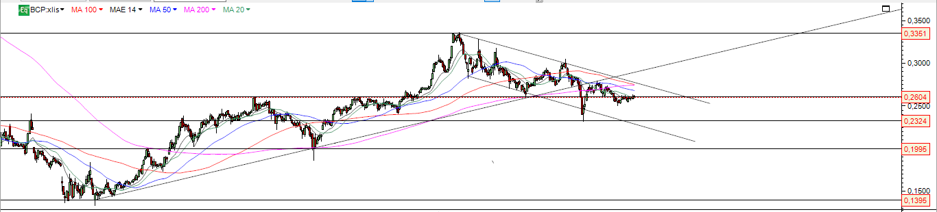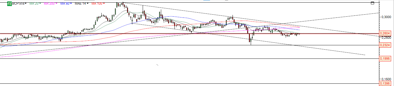 BCP com pouco volume e interesse do mercado , faz no final da semana novamente a recuperação á zona da forte resistência nos 0.26 e dali não passa .