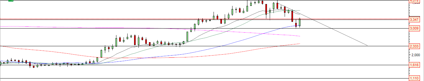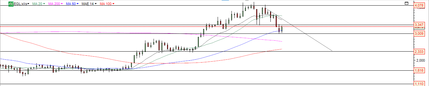 Após a queda até MM200 , o titulo faz uma recuperação técnica até 3.35 , ponto do anterior suporte bem visível no gráfico .