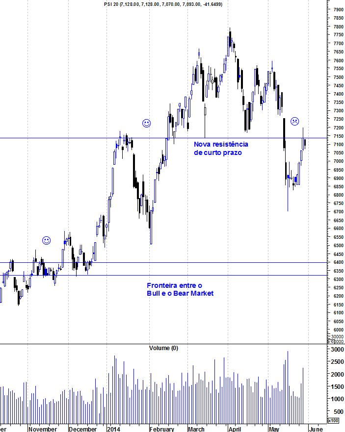 Deixo os gráficos actualizados do PSI, depois de ontem ter embatido na sua resistência de curto prazo e que é o grande teste à força dos touros neste horizonte temporal. Recordo que, em termos de longo prazo, continuo a considerar os touros no controlo das operações, colocando a fronteira entre o Bear e o Bull Market nos 6300 pontos.