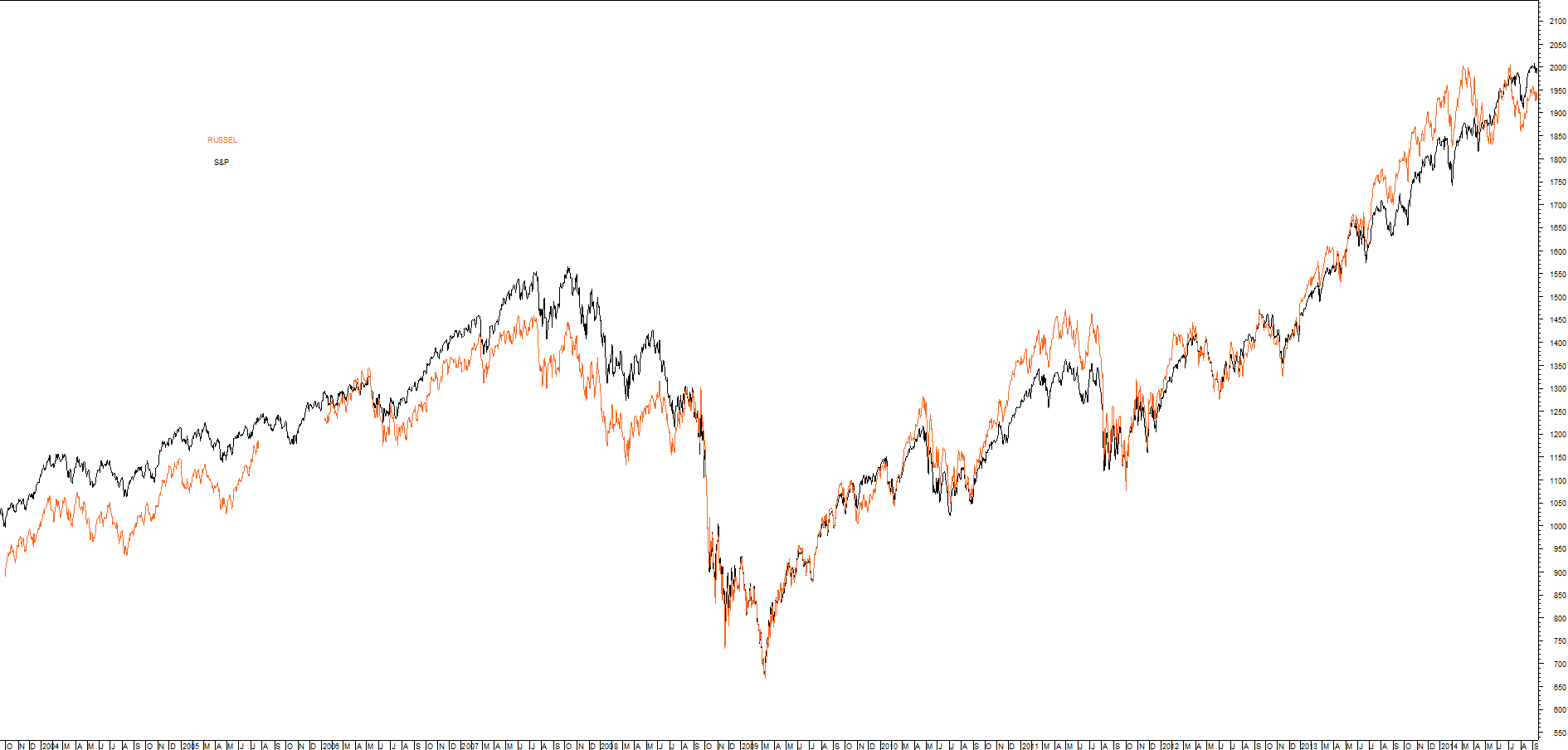gostaria de trocar umas impressoes sobre o fato do russel estar bastante mais fraco que todos os restantes indices americanos que estão sempre a atualizar novos maximos. Para mim é estranho as small caps estarem bastante longe dos max e estarem cada vez mais fracas e se porventura temos uma frqueza forte nos indices principais o russel parte -se todo.