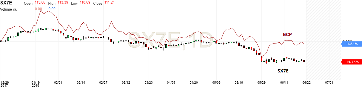 Com o sector bancário na Europa em tendência descendente, tudo fica mais difícil para o bcp (2018 YTD):