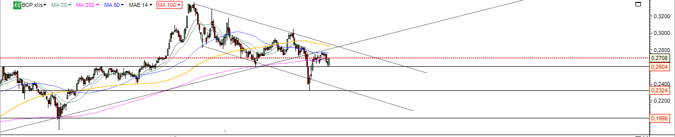 O mais provável com o atual evoluir dos mercados internacionais é quebrar a zona dos 0.26 e visitar novamente valores inferiores