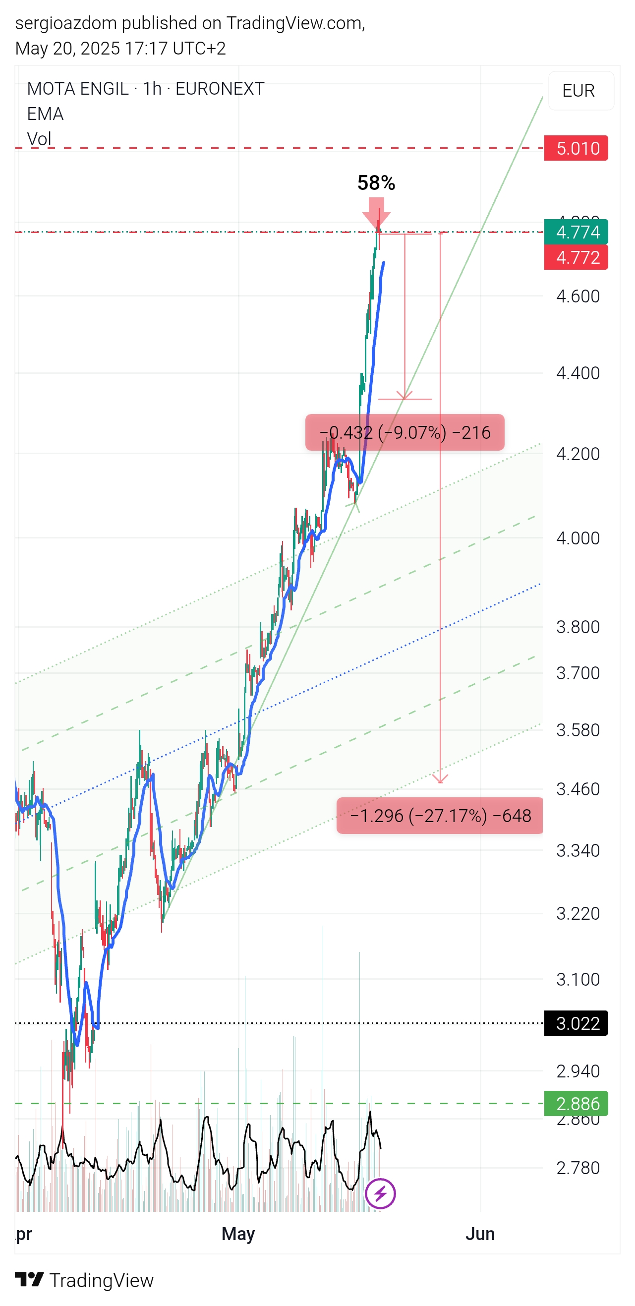 Eu sai da ME nos 3,90 porque estava a bater no topo do canal ascendente, e com dois shorts abertos esperava uma quedazita ou até um quedazona daquelas de 10% num só dia.