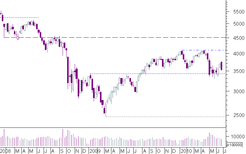 Posteriormente fez um mínimo mais baixo que o anterior e ficou a negociar num range apertado entre os 3300 e os 3500 durante quase um mês. Aí a pergunta era: Distribuição ou acumulação? Os 3300 eram um suporte robusto e susteve a queda, esta indicação foi dada com o morning star, sinal inequivoco de entradas longas. Mas o mote estava dado, os 3550 foram definitivamente quebrados.